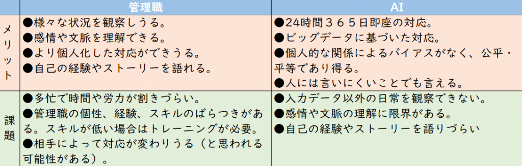 このことは必ずしも「AIによって管理職が不要になる」ことを意味しない。人間である管理職とAIのそれぞれにメリットも課題もある(下表参照)。単純に「完全にAIによって人間が代替される」と考えるのではなく、「AIによる支援を受ける」や「一部の業務はAIに代替してもらう(そして、人間はそれ以外の業務に注力できる)」と考えるのが、まずは良いだろう。