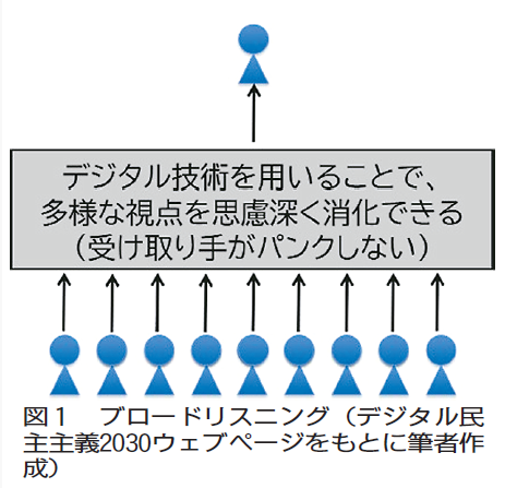 ‘i.school修了生の安野貴博氏を党首とするチームみらいは、「テクノロジーで政治と未来を良くする」ことを掲げている。都知事選や参院選で、AIアバター「AIあんの」による政策質疑応答、GitHub形式での政策更新など、技術を活用した選挙活動を展開した。背後には、多くの声を上手に収集し役立てようとする「ブロードリスニング」(図1)や参加人数と対話の深さが向上した「拡張熟議」の概念がある。