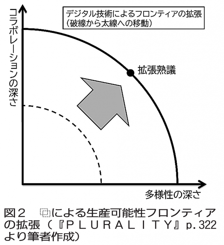 同書では、多様性にまたがるコラボレーションを人間のアイデンティティや創造性の源として重要視する。コラボレーションの深さと多様性の広さの間にはトレードオフがあるが、により生産可能性フロンティアを拡張できる(図2)。